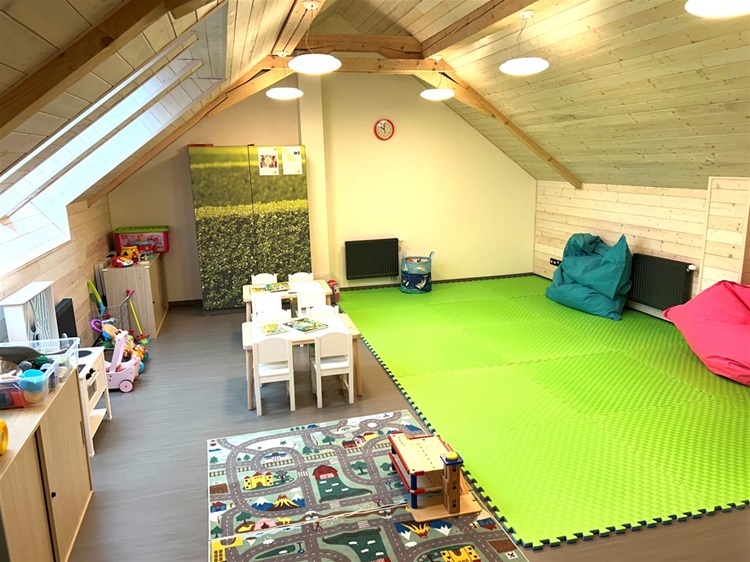 Součástí herny jsou hračky, knížky, skládačky, ale také přebalovací pult a umyvadlo.